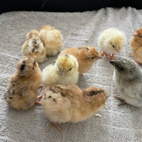 Kycklingarna hålls inomhus med värmelampa och har tillgång till fodertråg. Lämpliga för den som vill föda upp .