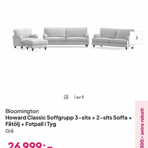 Grå tyg, Äkta Howardsoffgrupp. 2+3sitsig soffor. 2kuddar håliga i tyget & nopriga, därav priset på allt. Endast 1000kr