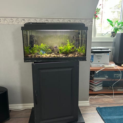 Säljes ihop med den låda som det står i. Det finns både ett lock till själva akvariet & lådan. Det är just nu uppbyggt som ett litet minipaludarium med inhemska insekter & kryp, vattendelen innehar lite inhemska vattensnäckor. Säljes med eller utan innehåll beroende på vad man önskar. Allt är inhemskt utom lite Palettblad & Spansk mossa. Ön som finns i akvariet är uppbyggt i en separat låda så den går lätt att flytta, höja eller ta ur om man vill.
