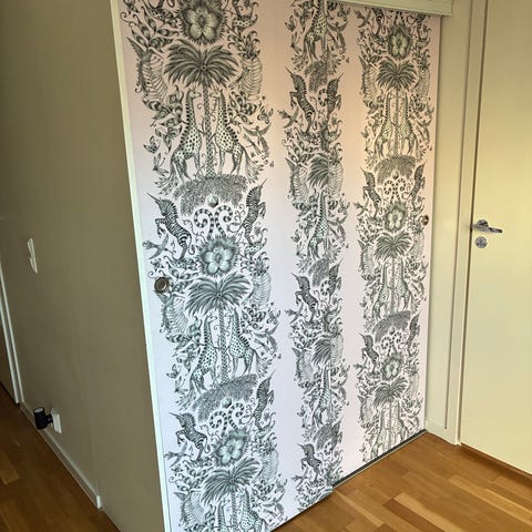 IKEA pax 50x229 cm. Vi har fyra dörrar en av dem har vi skarvat tapeten på men inget man tänker på.
