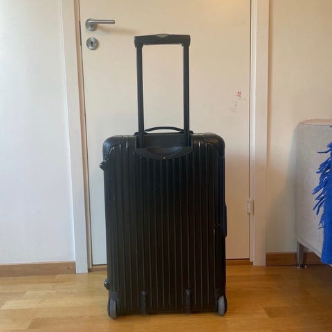 Rimowa resväska i hård plast för unisex. Väskan har ett skal med räfflad yta och fyra hjul för enkel rullning. Invändigt finns foder med avdelare och remmar för att hålla packningen på plats. Utsidan är svart med teleskophandtag upptill samt sidhandtag för att kunna bäras. Väskan är lämplig för resor där en rymlig hård kabin- eller incheckningsväska behövs.