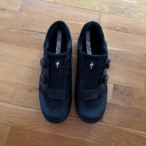 Specialized cykelskor i svart färg, storlek 45. Skorna har tre kardborreband för justerbar passform och en sula med grovt mönster anpassad för cykling med klickpedaler. Passar för exempelvis mountainbike eller pendling med SPD-liknande system där klossar kan monteras i sulan.