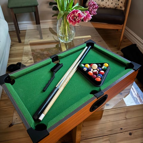 Om hjärtat klappar för biljardspel är det jobbigt att bo trångt, men nu kan du äntligen spela rakt på köksbordet och spara lite plats! Det här biljardspelet är en miniatyrversion av the real deal och kan enkelt ställas undan när det inte används. Perfekt för dig som vill smygvässa dina skills när ingen ser!