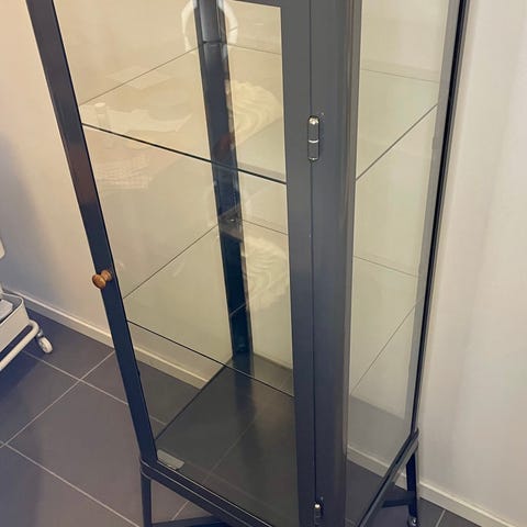 Fabrikör, grått stilrent vitrinskåp i metall och glas från IKEA som har utgått.