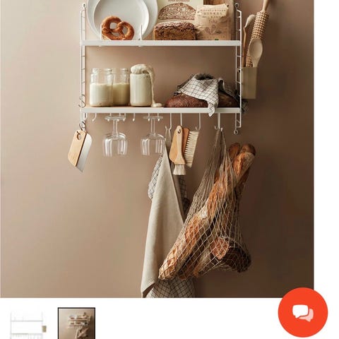 String Pocket vägghylla i design av Nils Strinning. Hyllsystemet består av tre hyllplan i valnöt och två gavlar i vit metall. Mått enligt förpackning: höjd ca 50 cm, bredd ca 60 cm, djup ca 15 cm. Passar för förvaring av böcker, dekorationer och mindre föremål i exempelvis vardagsrum, kök eller hall.