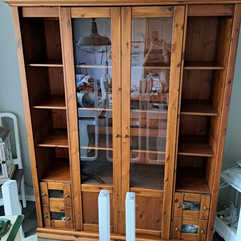 Säljer ett helt nytt svart vitrinskåp i plåt. Hyllplanen i skåpet går att flytta upp/ner.