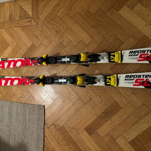 Stöckli Laser GS alpinskidor i röd färg med monterade bindningar. Modellen är en GS (storslalom) skida, anpassad för piståkning. Bindningarna är integrerade på platta. Passar åkare som söker en stabil skida med maximalt grepp i pisten för långa sköna svängar.