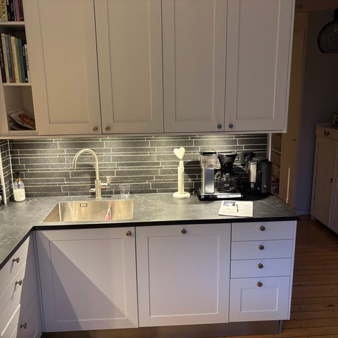 Sprutlackerade köksskåp och lådhurts från Marbodal med handtag från IKEA.