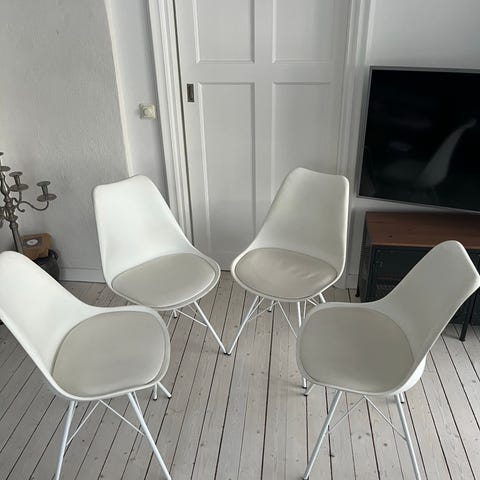 Vita fina stolar med metallben, 4 st inklusive dyna säljes i bra skick.