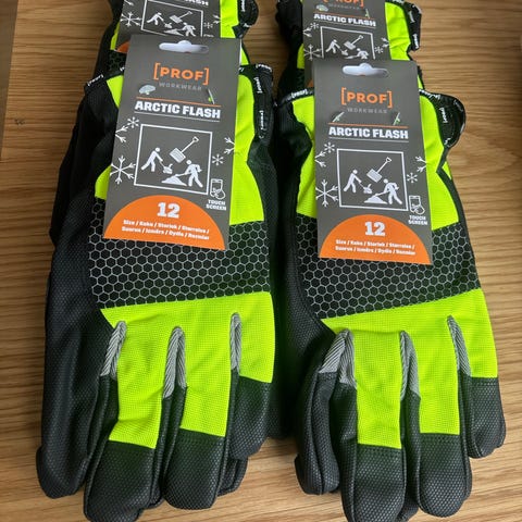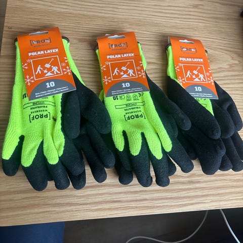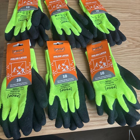 12 pack Prof Polar Latex arbetshandskar i storlek 10. Handskarna har gul ovansida i textil och grå latexbeläggning i handflata och på fingrar för bättre grepp. Lämpliga som skydds- och arbetshandskar vid olika typer av hantverk och utomhusarbete i kallare miljöer.