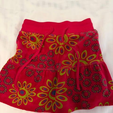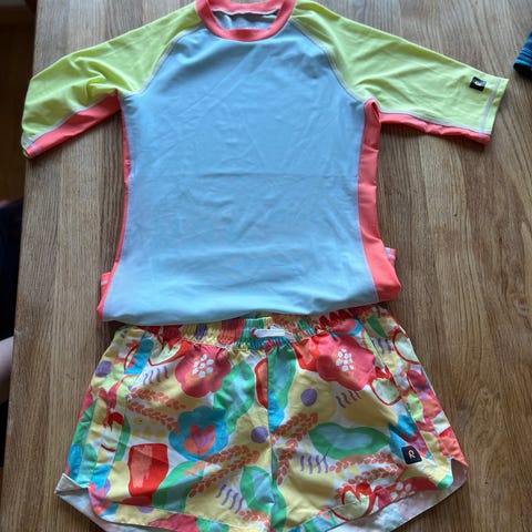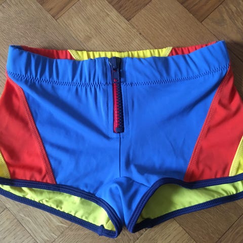 Säljer ett par färgglada badshorts med röd front, orange midja och benkant samt blommigt mönster i vitt, rosa, rött och brunt på sidorna. Shortsen har snörning i midjan och coola kontrastdetaljer. Perfekta för stranden eller poolen! Finns en fläck.