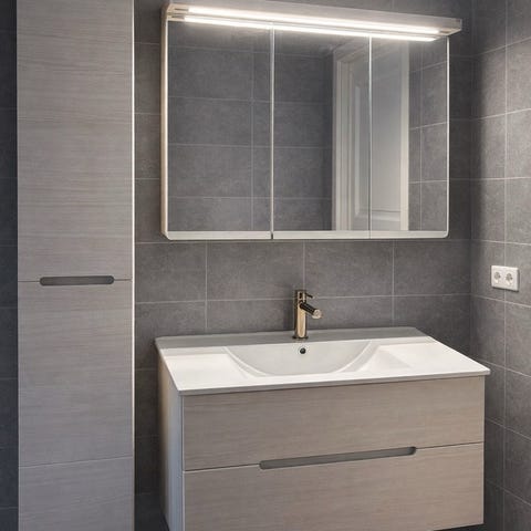 Kommod, spegelskåp, högskåp inklusive belysning, blandare, bottenventil och avlopp.