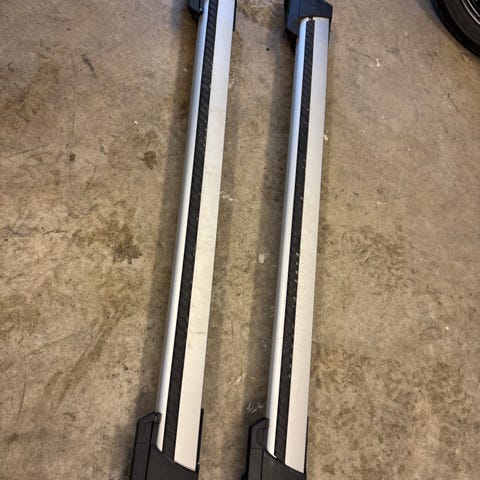 Volvo takräcken i aluminium med svart plastfot. Räckena är i silverfärg med integrerat spår för infästning av lasttillbehör. Passar bil med takrails eller enligt Volvos specifikation för denna typ av takräcke. Lämpliga för transport av till exempel takbox, cykelhållare eller annan last på biltaket. Nyckelhål finns för låsning, kompatibelt med Volvos låssystem för takräcken.