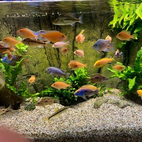 I akvariet finns ett stort Juvel XL innerfilter samt Moving bed filter, Fluval termostatvärmare med display. wavemaker EHEIM streamON och fint ljus från 2 LED ramper från Hygger. Sand, sten och växter ingår samt en del fisk om man så önskar. Detta är det övre akvariet. Ställningen ingår ej.