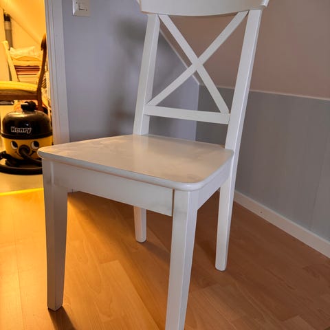 Vit stol med rundad rygg och sits i slät yta. Stolen har fyra smala ben i metall med lätt utställd form. Passar som matstol eller extra stol i kök, vardagsrum eller arbetsrum. Neutral design som fungerar i många olika inredningsstilar.