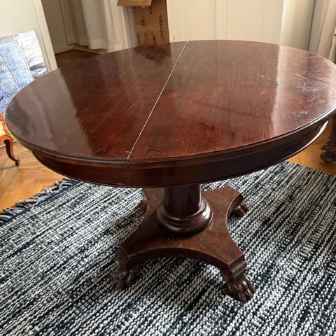 Ovalt utdragbart matbord i brun träfinish. Bordet står på en central pelarfot med fyra ben. Bordsskivan består av två delar som kan dras isär för iläggsskiva eller förvaring av skivor. Passar som matbord eller köksbord i exempelvis matsal eller kök. Träytan har synlig ådring och en klassisk utformning. Stolar med röd stoppning ingår i priset.