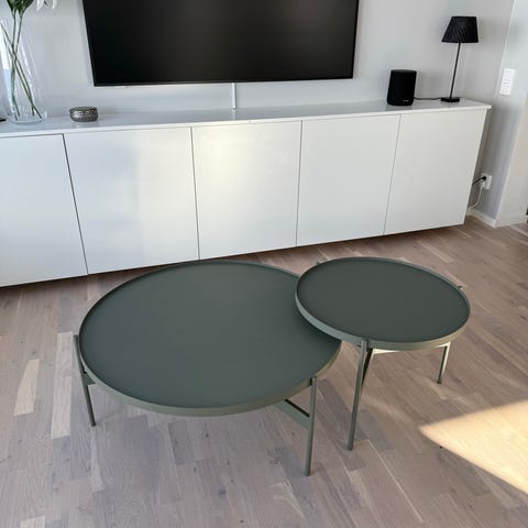 Smart satsbord, kan användas ihop el som två separata bord. Luftigt intryck, glas och vitlackad metall, lätt. Korrekta mått på bildskiss. En liten repa på lilla bordets glasskiva, knappt synlig.