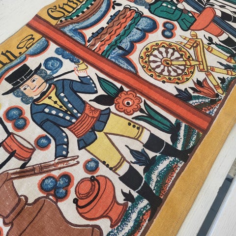 Gammal bonad med blommor och text i färgtryck. Bonaden är lite blekt på mitten i vikvecket, samt en liten blekt fläck på vänster sida vid ordet "Där". Se bilder.