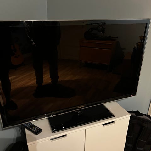 LG TV för hemmabruk. Platt skärm lämplig för tv-tittande, film och spel. Kan placeras på tv-bänk som på bilden eller väggmonteras med kompatibelt väggfäste beroende på modellens fästhål och vikt. Anslutningar och exakta mått varierar beroende på specifik modell.