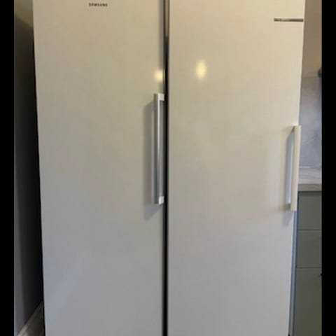 Samsung Side-by-Side kyl och frys i vit färg. Modellen består av två separata skåp placerade sida vid sida, ett kylskåp och ett frysskåp. Båda enheterna har digital panel på fronten för inställning av temperatur och funktioner.