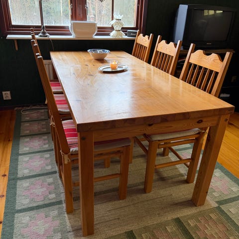 Fin matgrupp i ek från Mio med 6 stolar och en iläggskiva som är 50 cm lång.