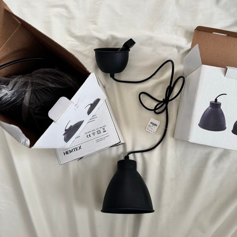 Takskena i svart metall med tre utgångar för hängande lampor. Lamppropp med anslutningsklämma ingår. Lampsladd och ljuskälla ingår inte. Längd 85 cm. Bredd 6 cm. Höjd 4 cm.