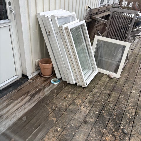 5 st Fönster med måtten ca, 150x200 cm. Fönsterna med 1 öppningsbar del i vit karm. Ena delen är fast och den andra delen är öppningsbar. Passar för montering i yttervägg på exempelvis villa, fritidshus eller förråd. Exakta mått och glastyp framgår inte av bilderna och kan behöva mätas på plats.