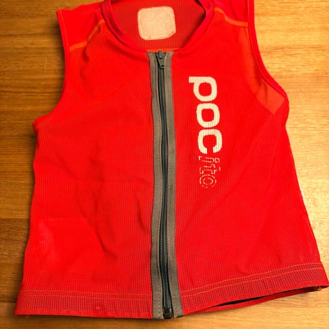 POC POCito VPD ryggskydd väst i storlek L för barn. Modellen är POCito VPD Back AS-1 och är avsedd som ryggskydd vid cykling, snowboard och alpin skidåkning. Västen är orange med dragkedja framtill och har integrerat VPD-skydd i ryggen. Yttermaterialet är i textil med ventilerande meshpartier för ökad komfort. Passformen är västmodell som bärs nära kroppen under ytterkläder.