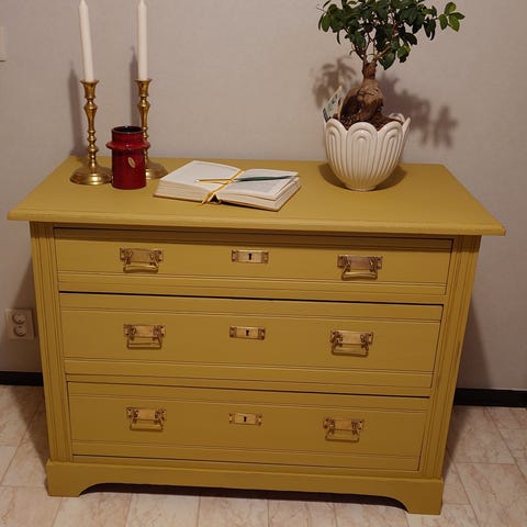 Säljer en mindre byrå/sängbord nymålad i jätte fin ljusgrön färg med fina guld beslag. Perfekt som ett avlastningbord.