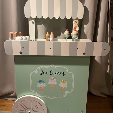Gullig glassvagn i trä med tygtak. Små glassar i trä medföljer samt en liten träskopa. Nypris ca 1500 kr.