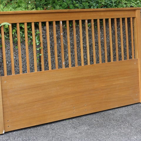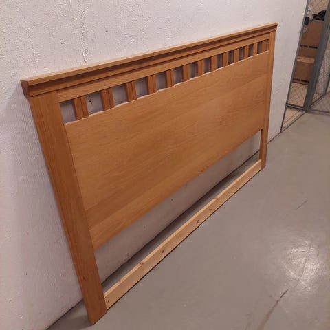 Sänggavel malm från Ikea med inbyggd förvaring. Förvaringen rullas ut på varje sida varav varje är 68 cm, med 4 hyllplan på varje sida.