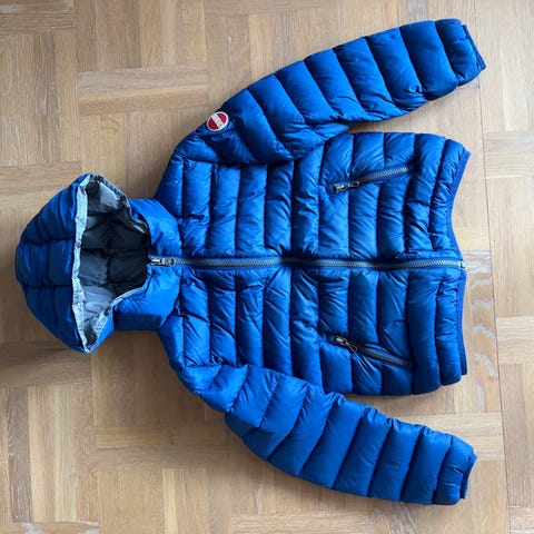 Patagonia dunjacka för barn, unisex, i storlek 5T . Jackan är blå och fylld med dun. Modellen har huva och dragkedja framtill samt fickor med dragkedja. Passar som ytterjacka för barn i vardag och utomhuslek i kallare väder.