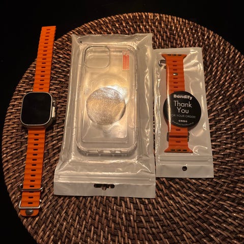 Apple klocktillbehör för smartklocka. Produkten består av ett klockskal med tillhörande armband som syns på bilderna. Passar Apple-klocka med rektangulär urtavla. Färg och material framgår av bilderna. Ingen ytterligare information om modell eller storlek finns angiven.