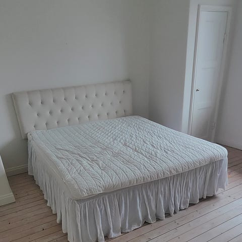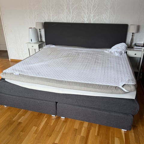 En Stavanger säng från ikea med medelhårda madrasser och Tussöy bäddmadrass (typ tempur material).