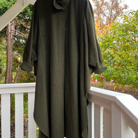 Brun ullkappa med läderdetaljer unikt designs sydd. Kappan har en hög krage i läder och knäpps med knappar framtill. Den har dekorativa ränder i svart tyg och orange läder. Fodret är i färgerna rosa, vitt och grönt.