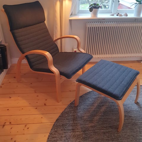 Unikt exemplar av Bruno Mathssons klassiska Pernilla med tillhörande fotpall. Professionellt omklädd med William Morris möbeltyg "Pink and Rose" av Sanderson. Fåtöljen är i perfekt skick men fotpallen har bristningar i linneväven som provisoriskt lagats med ett bredare juteband (lätt att ta bort).