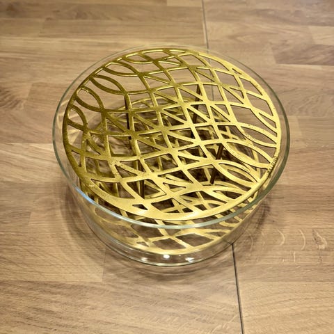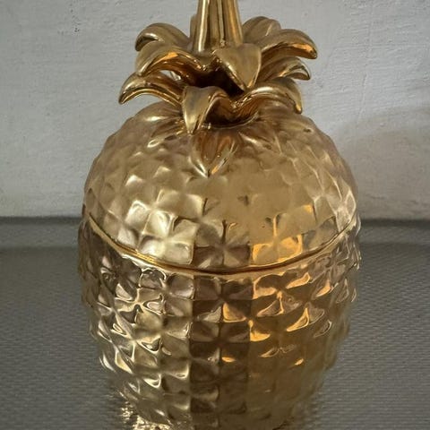 Dekorativt påskägg i guldig färg med präglad yta och rosett på locket. Ägget är tvådelat med löst lock och botten, och insidan är dekorerad. Passar för förvaring eller present av godis och småsaker vid påsk eller andra högtider. Ca storlek 17x20x25
