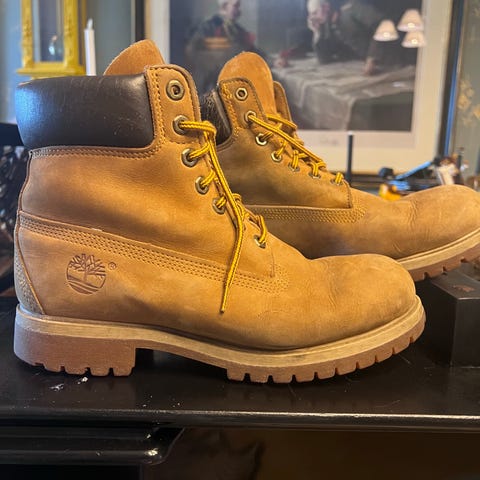 Timberland vinterskor i storlek 42. Skorna är i brun mocka med snörning och kraftig gummisula. Modellen är ankelhög och passar för kallare väder och vardagsbruk. Insidan är lätt vadderad för extra komfort. Färg och material framgår av bilderna som visar ovandel, baksida och sula med Timberland-logotyp.