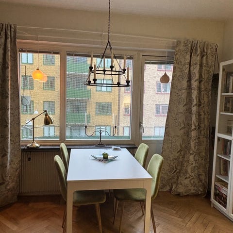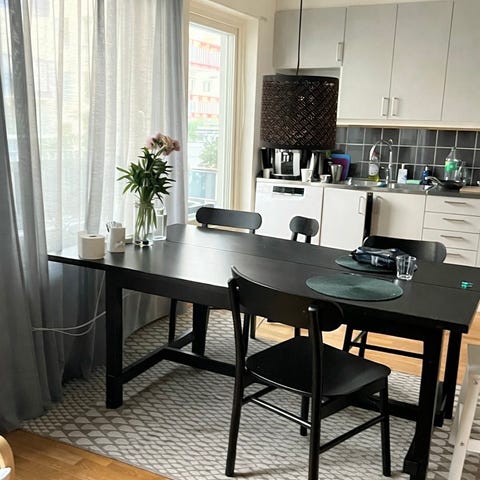 Matbord i industristil och 4 stycken stolar från IKEA säljes på grund av flytt. Matbordet är handgjort med betsade träplankor och underrede i svartsprayat stål. Stolsdynorna är slitna med fläckar och revor på två av stolarna och skulle behöva bytas ut, därav det låga priset. Träramen är dock i gott skick och stabila så stolarna har många fler år att ge. Det går enkelt att byta ut tyget mot eget tyg eller köpa nya överdrag.