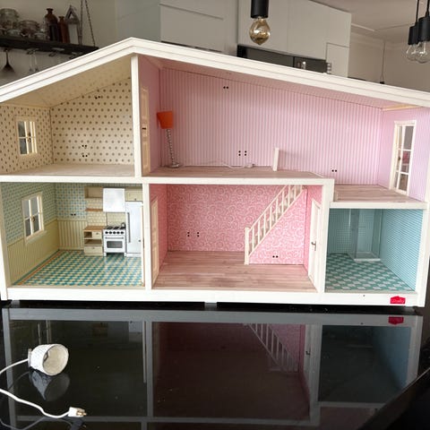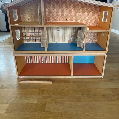Lundby dockskåp med flera rum och tillhörande möbler. Huset är inrett med bland annat soffgrupp, bord och stolar, gungstolar, pianoliknande möbel, matgrupp samt olika mindre inredningsdetaljer. Tapeter och golv har ett tidstypiskt mönster och färgsättning. Passar för lek med dockor i mindre format och som samlarobjekt för den som är intresserad av dockskåp och miniatyrinredning.