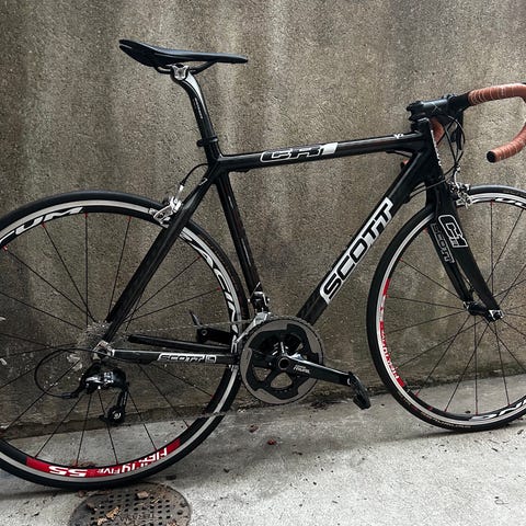 Scott cr1, stl extra small. Campagnolo record 10-delat. Fulcrum racing 1 hjul med kanttråd. Record titankassett 23-11. Vevarmar 170 mm. Cat eye cykeldator med kadensmätare. Inga pedaler. Ett par Campagnolo träningshjul medföljer. Pris: 9500:-
