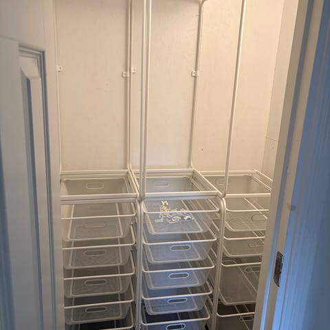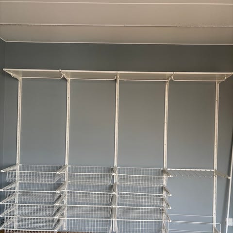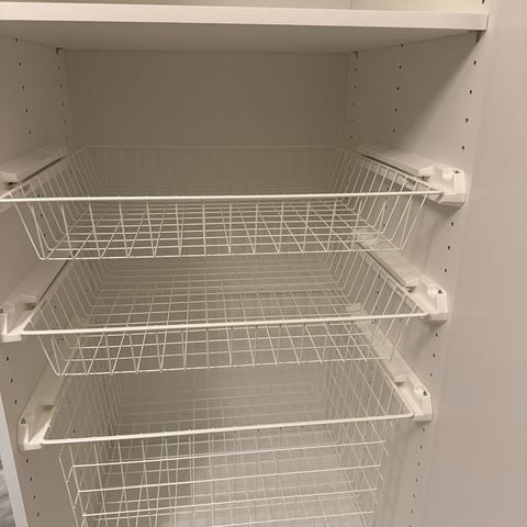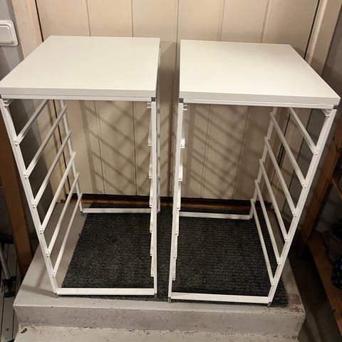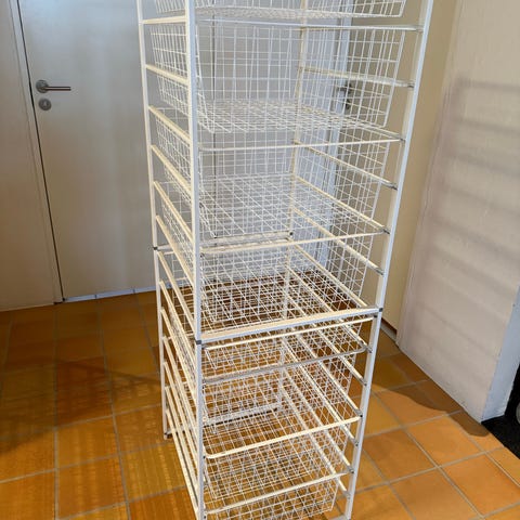 Elfa Aage Petersen trådbackar i vit metall för väggmonterat förvaringssystem. Består av flera utdragbara trådbackar monterade i skenor på vägg. Lämpliga för förvaring av kläder, textilier eller andra föremål i garderob, förråd eller tvättstuga. Systemet är öppet vilket ger god överblick och ventilation av innehållet.
