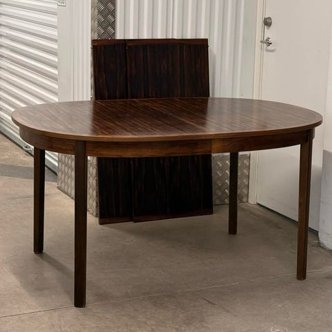 Snyggt middagsbord av ek i bra skick - helt och stabilt Bordet har två förlängningsskivor och dessa kan förvaras under bordsskivan när de inte används. Måtten är : längd 140 cm, bredd 90 cm, höjd 72,5 cm. Två extraskivor à 45 cm. Maxlängd 230 cm. Benen kan skruvas av för enklare transport. Bordet minns på Södermalm vid Zinkensdamm.