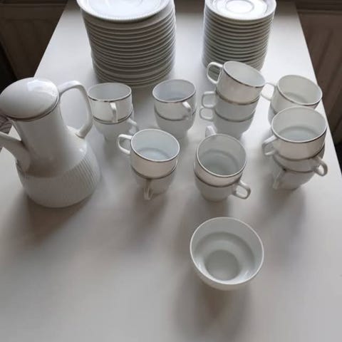 En servis med 13st kaffekoppar och tillhörande fat, 12st assietter samt en kaffekanna.