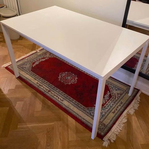 Skänker ett äldre IKEA matbord i vit färg. Bordet är ovalt och har två iläggsskivor så det går att förlänga vid behov – perfekt när man får gäster.