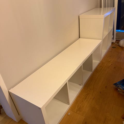 IKEA förvaringsmöbel hylla i vit färg. Möbeln har tre öppna fack som kan användas för förvaring av till exempel lådor, korgar eller böcker. Passar som låg förvaringsenhet i vardagsrum, hall eller barnrum. Ytan är slät och lätt att torka av. Vissa mindre märken och spår av användning kan förekomma på skivan enligt bilderna.