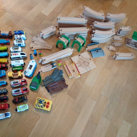 BRIO tågbord med trätåg och räls. Bordet har en upphöjd spelplan med fast monterad träräls, broar, tunnlar och tillbehör som stationer och byggnader. Passar för lek med BRIOs trätåg och andra kompatibla trätågssystem. Bordet ger en avgränsad lekyta och gör det enkelt att förvara tågbana och vagnar på plats.