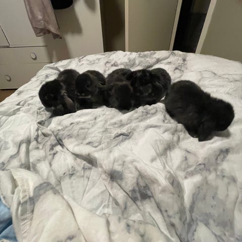 De är inte jättevana att bli burna men hon med mest svart i huvudet är den som är lugnast om man bär henne, den andra sprallar mer. De brukar ha buren öppen så att de kan hoppa fritt. De gör sina behov i buren när de är lösa.
