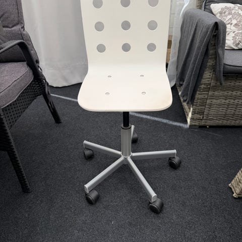 Höj och sänkbar stol med hjul. Lite avskavd färg på vissa ställen, se bilder. Dock inget som har påverkat funktionen och inget vi tänkt på förrän nu när stolen skulle fotas.