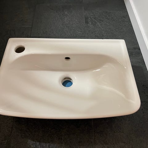 Dubbel handfatsbänk i sten med två svarta tvättställ